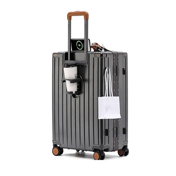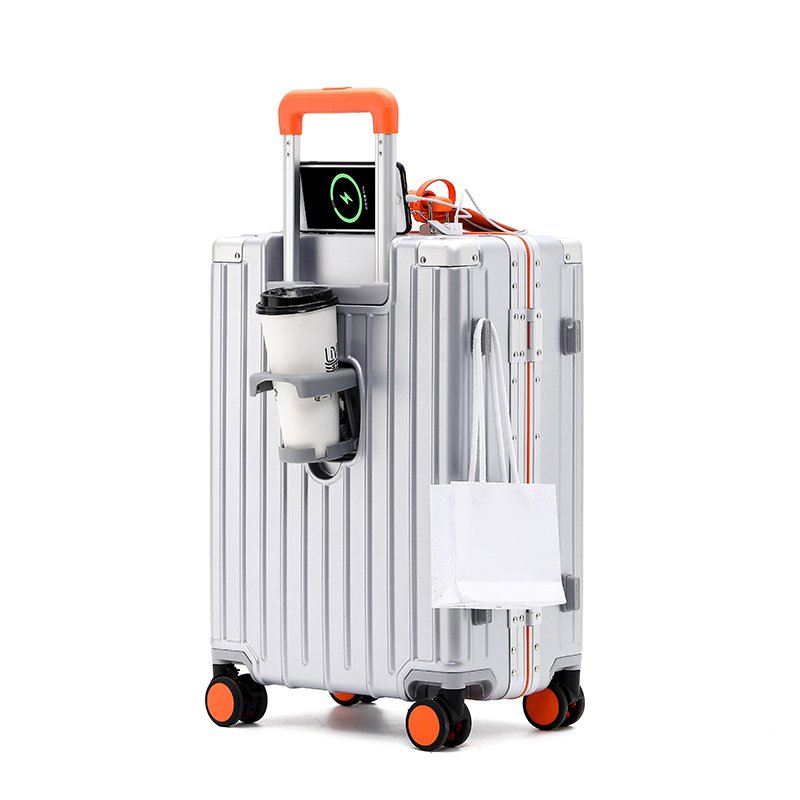 Multi-functional aluminum frame ABS hard handle suitcase with universal wheel lock, water cup holder, carry-on suitcase